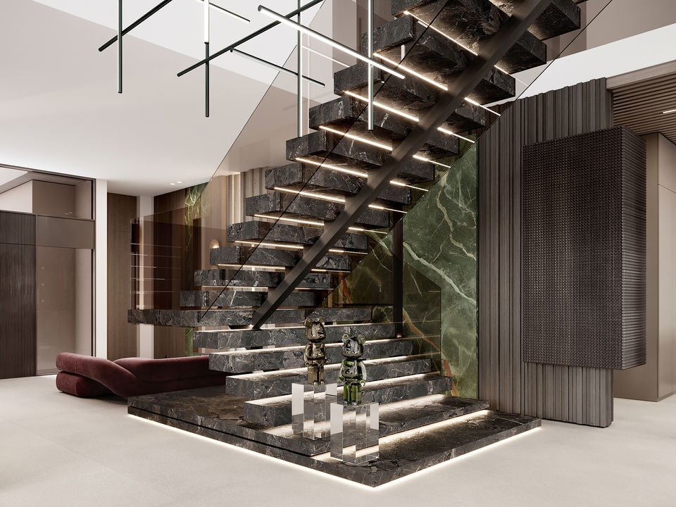 The Design in this villa C’est ici exudes bold sophistication, embracing abundant natural light and a striking interplay of dark elements. Dramatic marbles and rich dark walnut wood accents create a captivating contrast, offering a seamless blend of opulence and modernity.