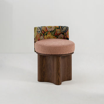The Luna Stool reflects the essence of quiet strength — a sculptural form rooted in craftsmanship and emotion. Its rounded silhouette and curved timber base evoke a sense of grounded serenity, while the soft upholstered seat and textured backrest invite comfort and tactility.