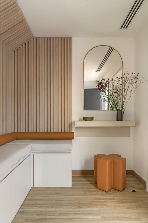 Using natural marble and oversized stems placed in sculptural and eclectic accessories, we achieved a modern, stylish and timeless look suitable for a family-oriented entertainment room.