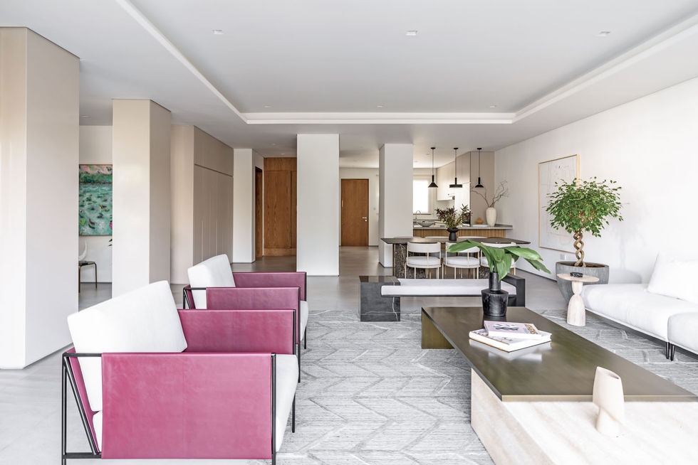 Using abundant oversized plants and dried stems placed in sculptural and abstract accessories, we achieved a modern, sleek yet comfortable living and dining space suitable for hosting large social gatherings.